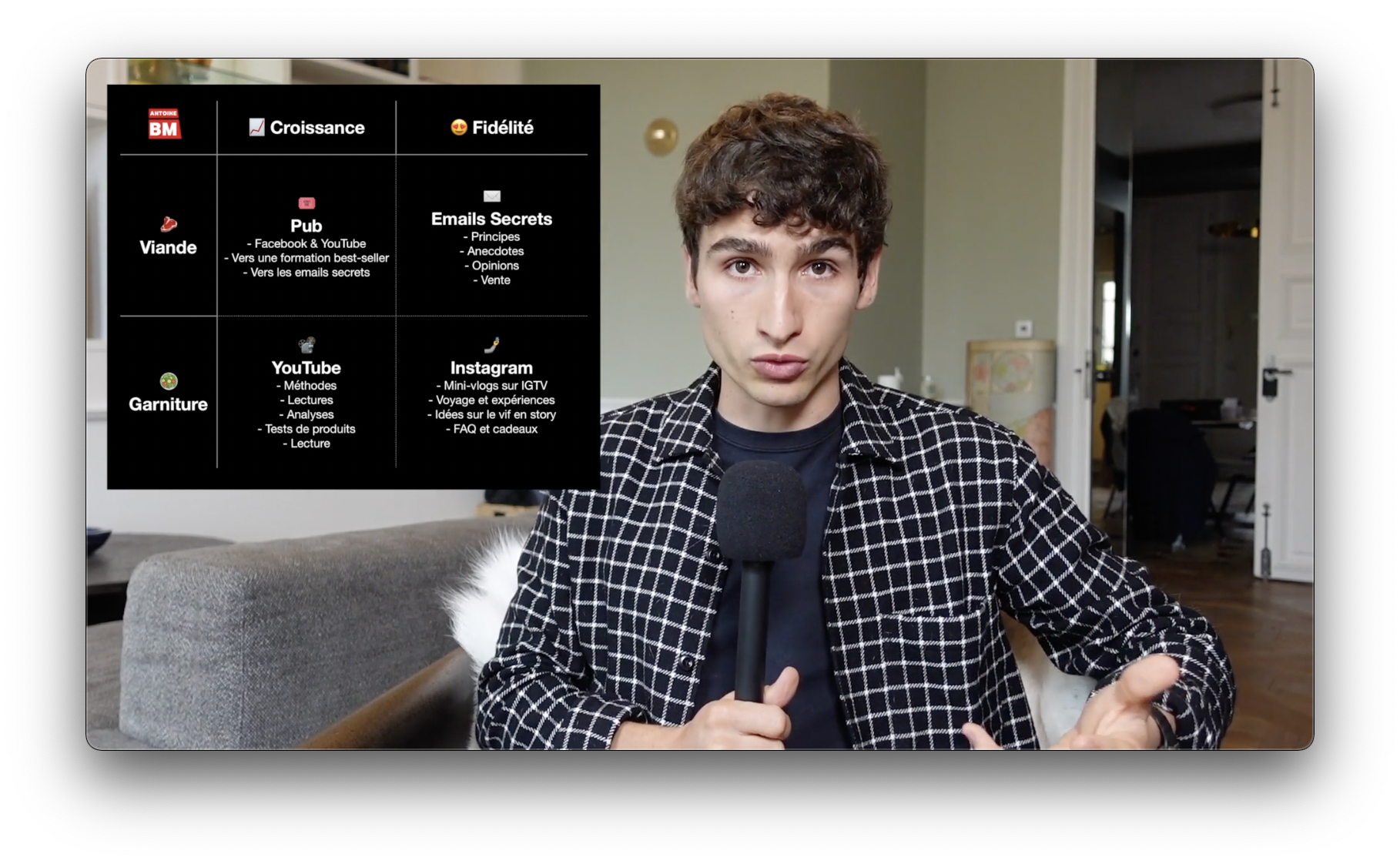 - Ma stratégie de contenu en détail (email, YouTube, pub, Instagram…)